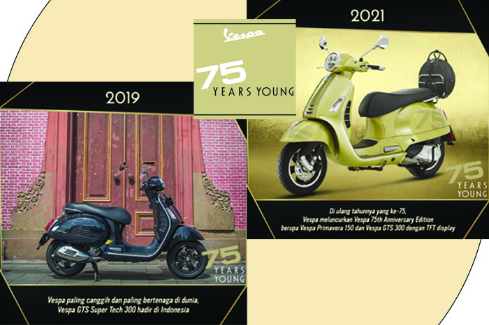 Dalam keterangan persnya secara tertulis pada Selasa (3/8/2021) di jelaskan bahwa di usianya yang baru ke-75 tahun, Vespa masih dan akan selalu berjiwa muda dan senantiasa relevan dari generasi ke generasi. Melihat ke belakang, begitu banyak cerita tentang Vespa yang begitu indah di seluruh dunia selama 75 tahun kehadirannya. Namun, yang paling penting saat ini bagi PT Piaggio Indonesia adalah untuk fokus melihat ke depan untuk menciptakan cerita-cerita ikonik lainnya, dengan Vespa, bagi masyarakyat Indonesia, yang sangat mencintai brand legendaris ini.