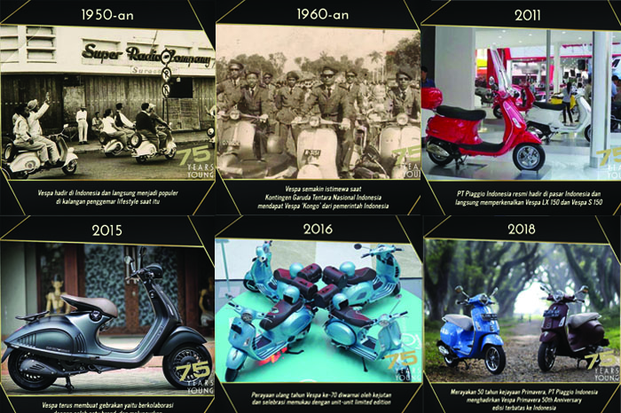 2021: Menjadi tahun penuh perayaan bagi PT Piaggio Indonesia, terutama bagi Vespa yang berulang tahun ke-75 dan telah mencapai lebih dari 19 juta unit produksi secara global. Sebelumnya, Vespa juga memberikan kejutan yang tidak kalah istimewa dengan Vespa Picnic untuk mereka yang menyukai kebebasan dan menghargai setiap momen kecil yang sangat berarti.