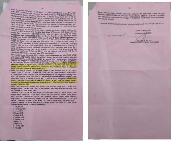 Arwan Koty harus berurusan hukum diawali dengan lapor melapor antara Arwan Koty sebagai pembeli Excavator dan Bambang Prijono sebagai penjual Excavator dari PT Indotruck Utama.