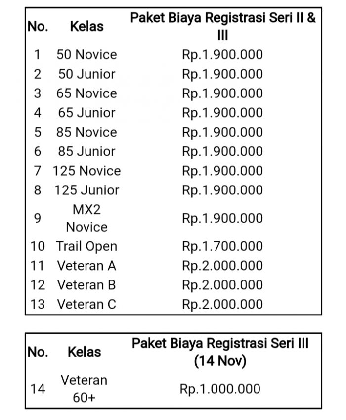 Grand Prize akan diberikan kepada Juara Umum kelas junior, yaitu 1 unit motor SE 85CC Husqvarna untuk 65cc junior class, dan 1 unit motor trail Kawasaki KLX 150cc untuk 125cc junior class. Tak hanya itu, pemenang juga akan mendapatkan hadiah seperti piala, uang dan sertifikat, dengan detail sebagai berikut: