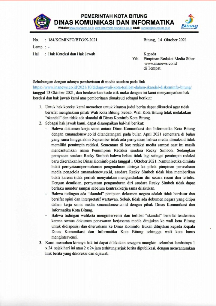 Dalam surat tersebut yang dikirimkan oleh Dinas Komunikasi dan Informatika Pemerintah Kota Bitung menyampaikan Hak Koreksi dan Hak Jawab sebanyak 4 point terkait pemberitaan pada INAnews.co.id pada hari Rabu 13 Oktober 2021 dengan judul ;