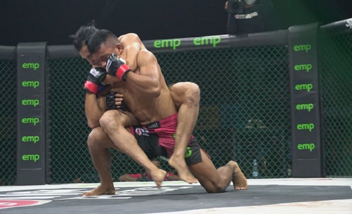 Kedua petarung melakukan clinch, Brandon melepaskan knee ke arah Gugun. Brandon berhasil lepas, Gugun melakukan tendagan namun bisa diblock oleh Brandon. Gugun melakukan take down, Brandon masih bertahan dan mencoba melakukan triangle choke. Tapi Gugun berhasil lepas, ia di posisi atas dan melakukan pukulan, ronde pertama pun usai. Ronde kedua dimulai, keduanya melakukan jual beli tendangan.