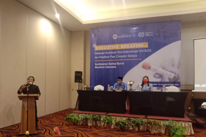 INAnews.co.id, Sukabumi – Hari AIDS Sedunia atau World AIDS Day (WAD) diperingati pada tanggal 1 Desember setiap tahunnya. Untuk itu dalam rangka memperingati hari HIV/AIDS sedunia Serikat Buruh Muslimin Indonesia (SARBUMUSI) menggelar acara Executive Breafing Deklarasi Komitmen Non Diskriminasi HIV/AIDS dan Pelatihan Peer Conselor Sebaya, dihotel Horison Sukabumi, Senin (29/11/2021).