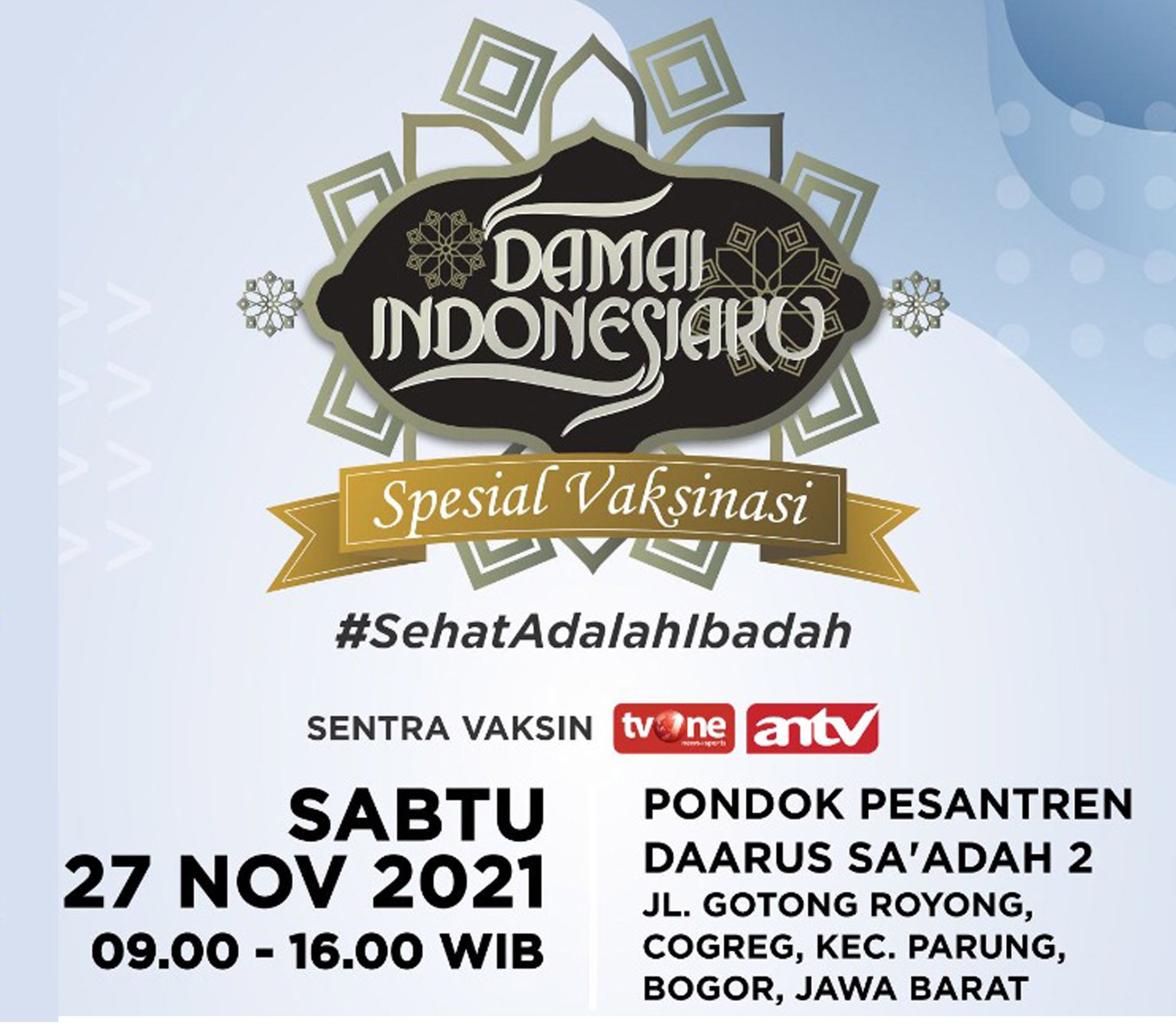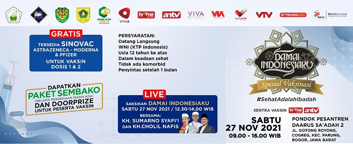 Pada kegiatan ini juga akan digelar acara Damai Indonesiaku Spesial Vaksinasi #SehatAdalahIbadah yang tayang LIVE di tvOne pukul 12.30 WIB – 14.00 WIB. Peserta yang telah divaksin akan mendapat paket sembako dari Bakrie Amanah (selama persediaan masih ada) dan berkesempatan memenangkan doorprize.