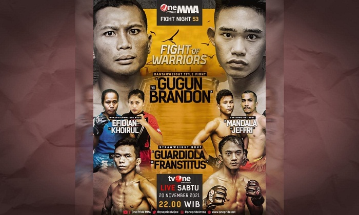 Saksikan keseruan pertarungan fighter terbaik tanah air hanya di OnePride MMA Fight Night 53 “Fight Fight of Warriors” LIVE hari Sabtu, 20 November 2021 pukul 22.00 WIB hanya di tvOne.
