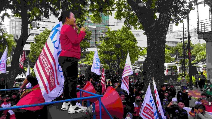 Presiden KSBSI – Elly Rosita Silaban, Lakukan Orasi dalam unjuk rasa di patung Kuda Monas, Jumat, 10/12/2021 (photo : dok INAnews)