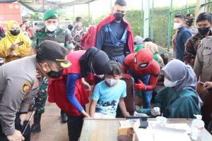 Uniknya dalam vaksinasi ini petugas menggunakan kostum super hero yang menjadi idola anak-anak, tujuannya untuk menarik minat, agar mau mengikuti vaksinasi.