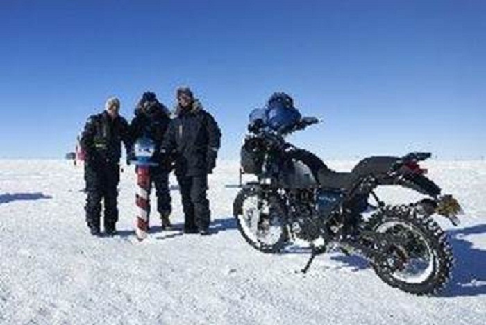 Tim ekspedisi dengan Royal Enfield Himalayan di Kutub Selatan geografis Antartika