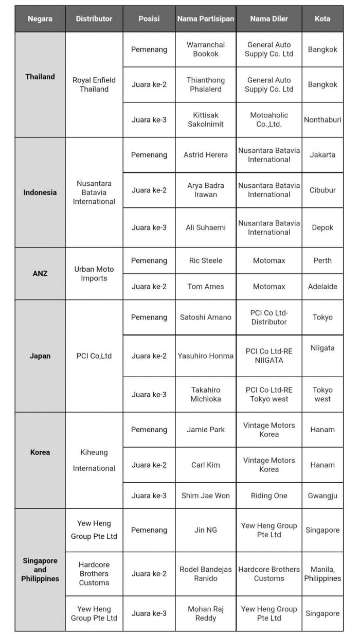 Daftar pemenang dan runner up khusus pasar Asia Pasifik, seperti yang diumumkan oleh Royal Enfield dapat dilihat di bawah ini: