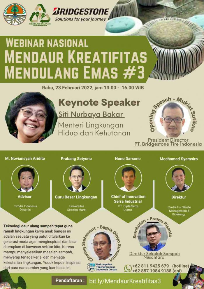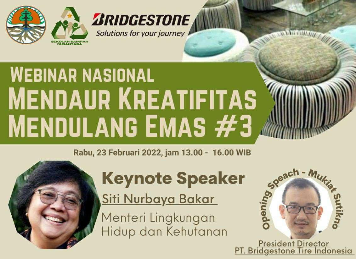 Puncak Webinar Nasional “Mendaur Kreatifitas dan Mendulang Emas” menampilkan Mukiat Sutikno, Presiden Direktur dari PT Bridgestone Tire Indonesia serta para pembicara yang merupakan aktivis penggiat teknologi ramah lingkungan dalam pengelolaan sampah, seperti Prabang Setyono Guru Besar Lingkungan dari Universitas Sebelas Maret, Mochamad Syamsiro Direktur Center for Waste Management & Bioenergy dan masih banyak lagi.