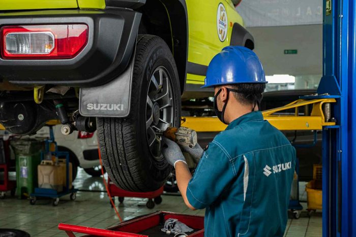 - Perawatan di Bengkel Resmi Suzuki. Setelah melakukan pemeriksaan sendiri di rumah, pengemudi dapat membawa mobilnya ke bengkel resmi Suzuki apabila mobilnya mengalami kerusakan. Selain itu, pengemudi juga wajib ke bengkel untuk melakukan pemeriksaan misalnya seperti wheel alignment, pemeriksaan komponen rem, dan pemeriksaan saringan udara kabin mobil. Selain dilakukan oleh tenaga ahli, pemeriksaan di bengkel resmi juga memiliki keuntungan lain, yaitu garansi suku cadang resmi untuk mobil Suzuki.