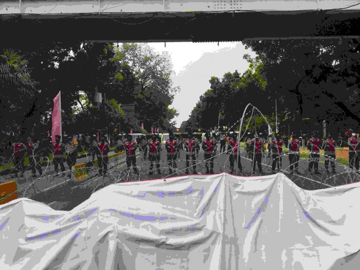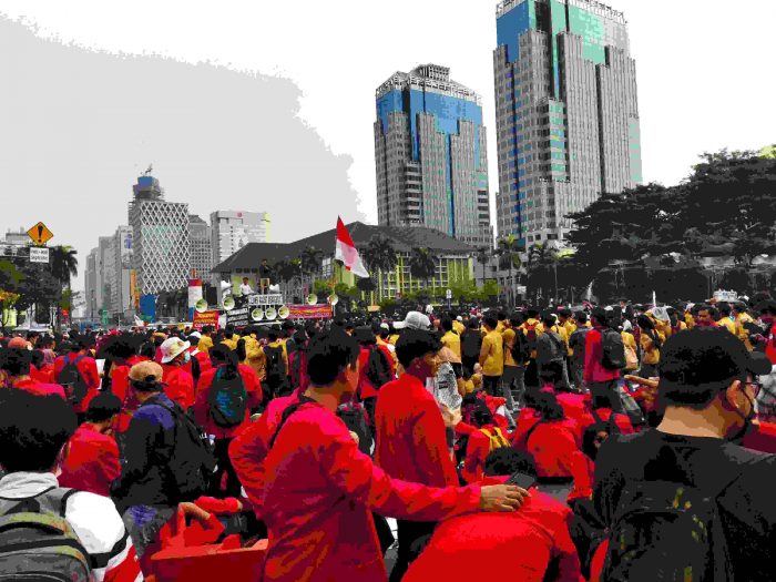 Mereka bergabung dengan peserta demo mahasiswa dan elemen organisasi masyarakat yang telah tiba di depan patung kuda Monas. Hujan gerimis yang sempat turun di sekitar Monas sudah mereda meski langit masih mendung.Massa terus merangsek masuk mendekati jalan merdeka Barat yang sudah di blokade kawat berduri.
