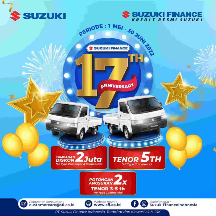 INAnews.co.id, Jakarta – Untuk memeriahkan perayaan ulang tahun ke-17, PT Suzuki Finance Indonesia (SFI) hadirkan beragam promo spesial untuk kosumen. Setiap konsumen yag melakukan pembelian mobil penumpang maupun mobil niaga di SFI dipastikan akan mendapat beragam keuntungan, mulai dari potongan harga, tambahan tenor, potongan angsuran, hingga uang muka rendah dan hadiah menarik lainnya. Promo istimewa ini berlangsung mulai 1 Mei hingga 30 Juni 2022 mendatang.