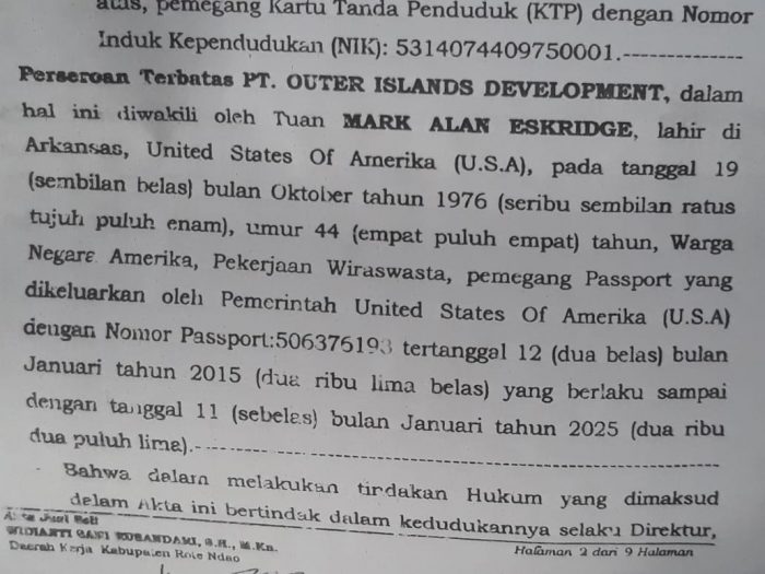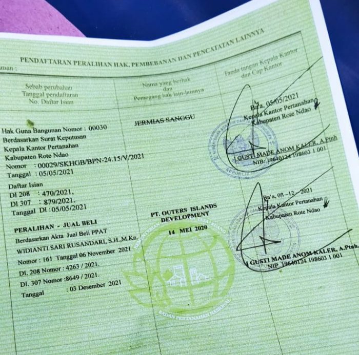 Tanah Jermias Sanggu dijual kepada PT Outer Island Development dan berubah status kepemilikan dari Sertifikat Hak Milik menjadi Hak Guna Bangun berdasarkan Surat Keputusan Kepala Kantor Pertanahan Kabupaten Rote Ndao, nomor : 00029/SKHGB/BPN-24.15/V/2021, tanggal 05/05/2021.