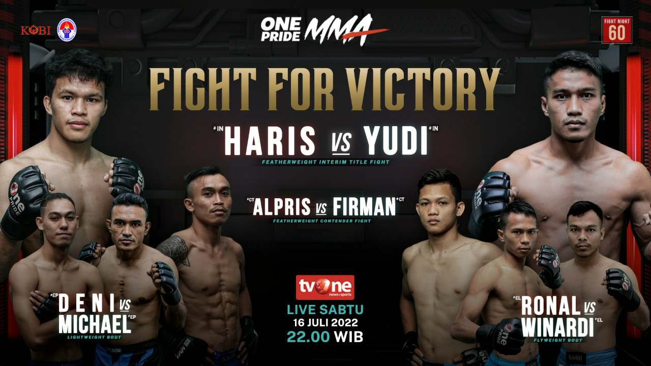 INAnews.co.id, Jakarta – One Pride MMA menghadirkan kembali pertarungan yang berkelas di Fight Night 60 “Fight For Victory” pada hari Sabtu, 16 Juli 2022. Delapan fighter akan saling menunjukan kemampuan terbaiknya untuk menjadi pemenang dan demi sebuah kebanggaan di dunia Mixed Martial Arts Indonesia. Laga yang akan disajikan diantaranya memperebutkan gelar nasional Interim Champion Featherweight dan perebutan tiket menantang juara dalam turnamen contender fight featherweight. Semuanya akan disiarkan secara langsung dari Tennis Indoor Senayan, Jakarta.