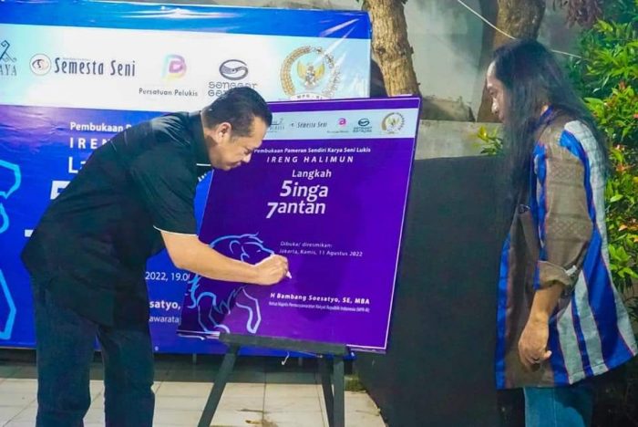 INAnews.co.id, Jakarta -Ketua MPR RI sekaligus Wakil Ketua Umum Partai Golkar Bambang Soesatyo mengapresiasi pameran seni lukis karya Ireng Halimun, bertajuk ‘Langkah 5inga 7antan’. Eksistensi Ireng dalam dunia seni lukis tidak hadir dari ruang hampa, melainkan dibentuk dan ditempa oleh latar belakang akademis dan pengalaman kehidupan. Ketertarikan Ireng pada seni sastra dan seni musik, semakin memperkaya karakter dan sosok Ireng sebagai seorang pelukis.