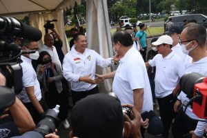 INAnews.co.id, Jakarta – Ketua MPR RI sekaligus Wakil Ketua Umum Partai Golkar dan juga Ketua Umum Ikatan Motor Indonesia (IMI) Bambang Soesatyo menemani Ketua Umum Partai Golkar sekaligus Menteri Koordinator Perekonomian Airlangga Hartarto jalan pagi bersama Ketua DPR RI sekaligus Ketua DPP PDI Perjuangan Bidang Politik dan Hubungan Antar Lembaga Puan Maharani. Sesuai jalan pagi, Airlangga Hartarto dalam kapasitasnya sebagai Menteri Koordinator Perekonomian dan Ketua Sherpa G-20 menyerahkan satu unit mobil listrik, Wuling, berwarna merah dan kuning kepada Puan Maharani sebagai Ketua DPR RI.