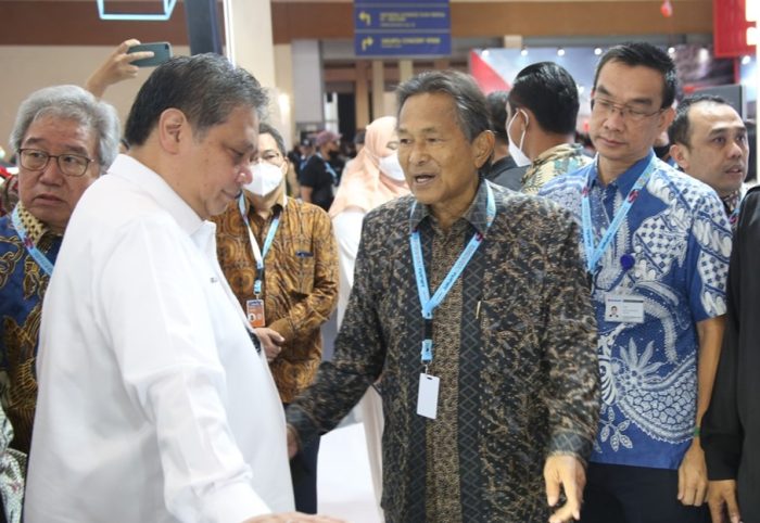 Menteri Koordinator Bidang Perekonomian, Airlangga Hartarto, berdiskusi dengan Soebronto Laras, Komisaris Suzuki Indonesia di Jakarta Auto Week 2023 di Senayan, Jakarta (foto : dok)