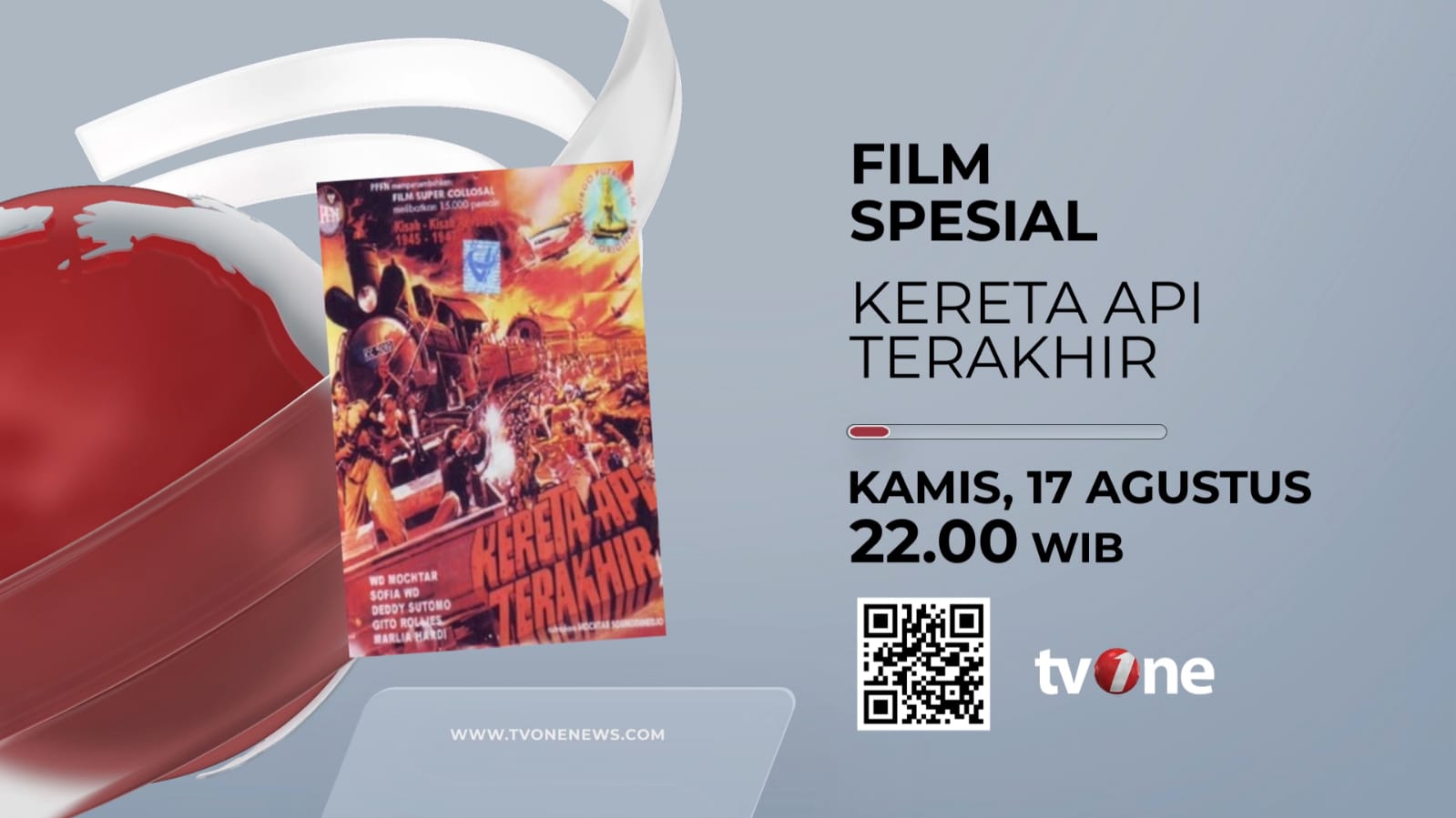 Sebagai pengingat sejarah kemerdekaan RI, tvOne secara khusus akan memutar Film Spesial Sejarah berjudul Kereta Api Terakhir yang akan tayang pada Kamis, 17 Agustus 2023 pukul 22.00 WIB. Film yang disutradai oleh Mochtar Soemodimedjo ini merupakan film Indonesia tahun 1981 yang diadaptasi dari novel Kereta Api Terakhir ke Jogjakarta: Roman Revolusi ’45 karya Pandir Kelana. Dibintangi oleh Deddy Sutomo dan Gito Rollies, menceritakan tentang perjuangan Tentara Nasional Indonesia karena gagalnya Perjanjian Linggarjati. Film berdurasi 2 jam 50 menit ini, juga dibumbui oleh kisah romansa baik tentang kepahlawanan, maupun kisah cinta antara dua manusia.
