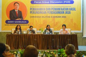 INAnews.co.id, Jakarta – Wakil Menteri Perdagangan, Jerry Sambuaga memberikan sambutan pada kegiatan Diskusi Kelompok Terpumpun (Focus Group Discussion) Pemahaman dan Pemanfaatan Hasil Perundingan Perdagangan Jasa yang dilaksanakan di Kabupaten Minahasa Selatan, Sulawesi Utara, Jumat (11/01/2024).