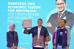 Menparekraf Sandiaga Uno saat hadir di ‘Sandiaga Uno Economic Vision for Indonesia’ Job Creation and Affordability For All di School of Government and Public Policy (SGPP), Cibinong, Kabupaten Bogor, Minggu (18/2/2024) menyampaikan visinya untuk ekonomi menuju Indonesia Emas 2045. Sandiaga mengedepankan penciptaan lapangan kerja hingga harga bahan pokok terjangkau.
