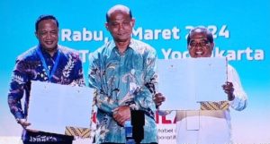 Penjabat Bupati Rote Ndao Oder Maks Sombu, SH,MA,MH (kemeja putih) menunjukan Naskah Komitmen Lokasi Modeling Budidaya Rumput Laut Tahun 2024 di Kabupaten Rote Ndao usai ditandatangani dalam Rapat Kerja Terpadu lingkup Kementerian Kelautan dan Perikanan Tahun 2024, rabu (06/03/2024) di hotel Tentrem, Yogyakarta.