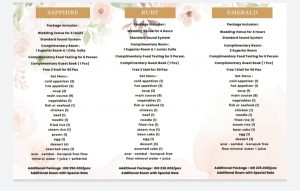 Selanjutnya Ronie menjelaskan secara detail “bahwa Oria Hotel Jakarta menawarkan 3 jenis paket wedding yaitu Paket Emerald, Paket Ruby dan Paket Sapphire. Untuk Paket Emerald Oria Hotel Jakarta menetapkan harga sebesar 25 Juta, dengan jumlah tamu undangan sebanyak 100 pax. Untuk Paket Ruby harga 35 Juta selanjutnya ada Paket Sapphire dengan harga 45 Juta Rupiah. Harga di atas sudah termasuk complimentary 2 room untuk kamar rias mempelai dan kamar pengantin.” tambah Ronie.