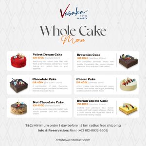 Tidak hanya itu, Vasaka Hotel Jakarta juga menawarkan promo Whole Cake dengan berbagai pilihan cake lezat untuk melengkapi momen spesial Anda, seperti Wedding, Birthday, Anniversary, dan momen spesial lainnya. Dengan harga Rp.400.000,- net per whole cake, Anda dapat memilih dari varian seperti Velvet Dream Cake, Chocolate Cake, Nut Chocolate Cake, Brownies Cake, Cheese Cake, hingga Durian Cheese Cake. Semua cake dibuat dari bahan berkualitas tinggi, dengan tekstur lembut dan rasa yang memanjakan lidah.