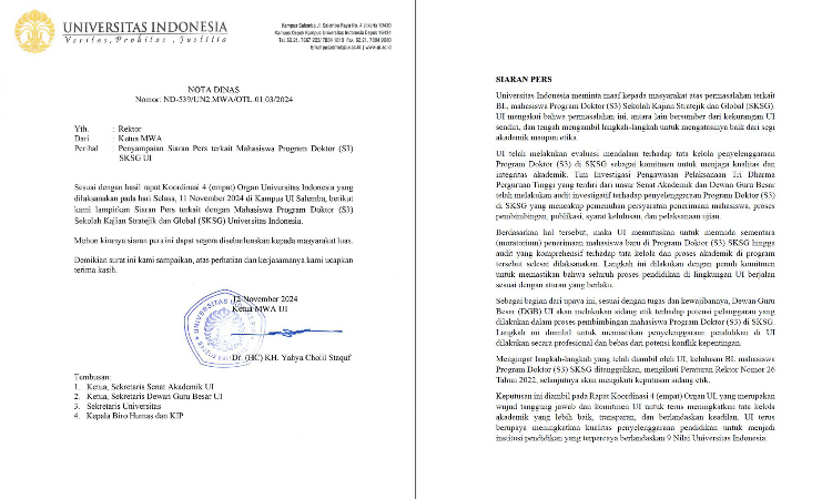 “Mengingat langkah-langkah yang telah diambil oleh UI, kelulusan BL mahasiswa Program Doktor (S3) SKSG ditangguhkan, mengikuti Peraturan Rektor Nomor 26 Tahun 2022, selanjutnya akan mengikuti keputusan sidang etik,” imbuhnya.