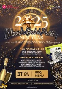 Black & Gold Party juga menyediakan menu All You Can Eat yang dapat dinikmati sepuasnya di tanggal 31 Desember 2024 sambil diiringi dengan Live Accoustic Performance, Kabaret Show, Dance Performance , Fashion Show dan Stand up comedy , untuk keluarga dapat menikmati keseruannya hingga jam 00.00 WIB.