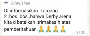 Terinformasi setelah pemberitaan viral bahwa oknum pengelolah Judi Sabung Ayam tersebut, telah mengirimkan pesan singkat melalui WhatsApp kepada sejumlah oknum Wartawan dan grup grup WhatsApp Judi Sabung Ayam, bahwa kegiatan Sabung ayam (Derby) dibatalkan.