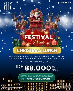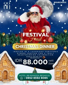 “Momen Natal dan Tahun Baru adalah waktu yang tepat untuk berbagi kebahagiaan. Melalui Christmas Feast, Christmas Hamper, dan AU REVOIR, kami ingin menghadirkan pengalaman yang hangat, berkualitas, dan berkesan bagi setiap tamu yang merayakan bersama Hotel 88 Mangga Besar 62,” ujar Aribowo.